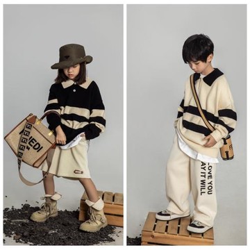 L+IKISSBABY潮牌男童女童2024秋冬新款韓版黑白條紋翻領套頭毛衣