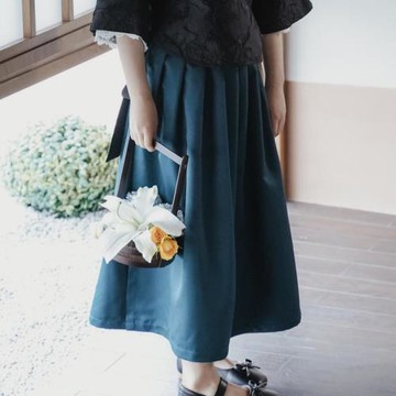 素色造型腰頭打褶傘襬中長裙