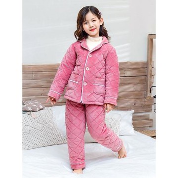 女童睡衣秋冬季加厚款三層夾棉睡襖套裝珊瑚絨中大兒童睡衣女親子