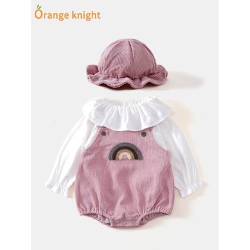 嬰兒春裝套裝女寶寶連帽燈芯絨背帶褲哈衣兩件套可愛超萌春秋衣服