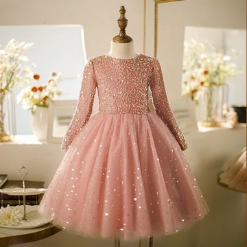 兒童禮服粉紅色亮片公主裙女童新年閃亮主持走秀演出服