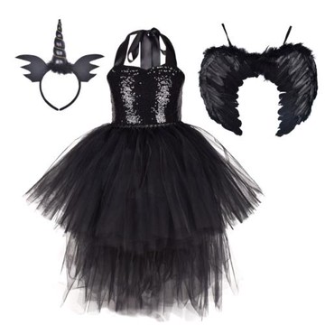 萬圣節兒童cos沉睡魔咒女巫連衣裙翅膀亮片禮服舞蹈派對tutudress