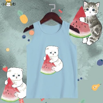 日系萌寵夏天貓咪與西瓜更配呀純棉背心男女兒童裝無袖t恤衫衣服