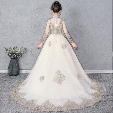 六一中大女童長袖蕾絲花童婚紗公主禮服長裙拖地鋼琴演出連衣裙