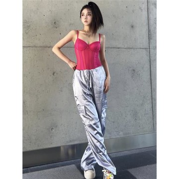 點我下載【清貨折褲F】Kaylee Wang透視網紗拼接吊帶背心連體衣松緊直筒褲