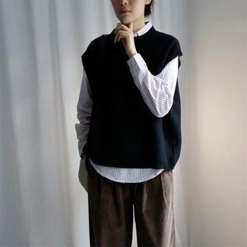 韓國chic夏季減齡穿搭圓領無袖條紋娃娃衫拼接鉤花鏤空大翻領襯衫
