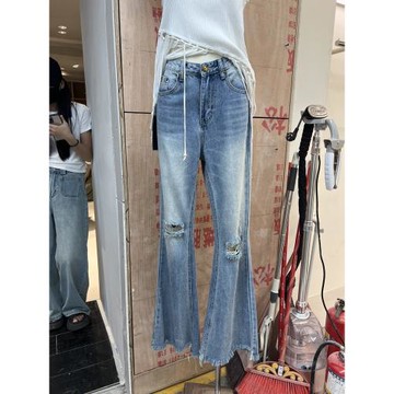 自留!花匣子flower高腰磨破洞牛仔褲 彈力顯瘦修身喇叭褲女62062