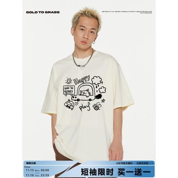 GTG原創美式復古潮牌貓咪插畫圓領短袖男純棉新款oversize版型T恤