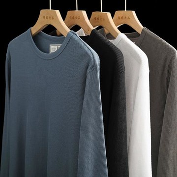耐久不變形!重磅全棉華夫格男士休閑百搭純色圓領長袖T恤打底衫