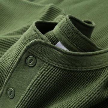 橄欖綠 310g重磅華夫格純棉面料 硬漢風亨利領純色長袖打底T恤男