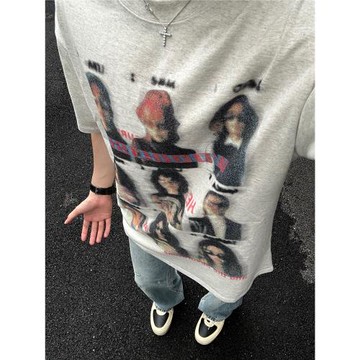 美式潮牌模糊人像短袖t恤男夏季寬松潮流高街花灰色純棉重磅上衣