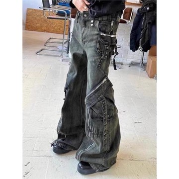 美式朋克重工綁帶牛仔暗黑女街舞飄帶解構工裝街頭輕亞闊腿暗黑風