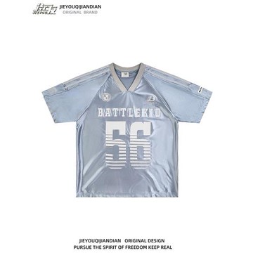 美式hiphop撞色V字母印花領短袖T恤男女寬松百搭運動風球衣半袖潮