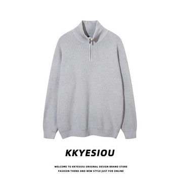 KKyesiou美式復古立領灰色針織衫外套男女學院風oversize情侶毛衣