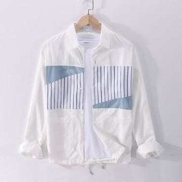 點我下載春秋男長袖純棉襯衫復古休閑青年翻領條紋拼色襯衣職業潮寸衫上衣