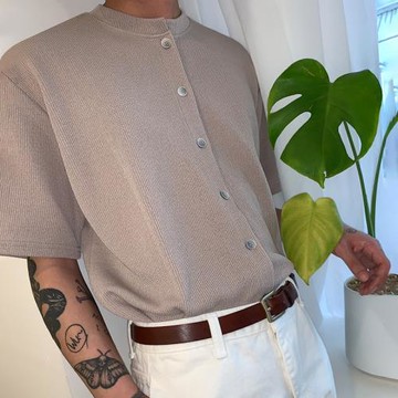 【AMERO】男裝 女裝 短袖T恤 華夫格 亨利領 寬鬆 排扣