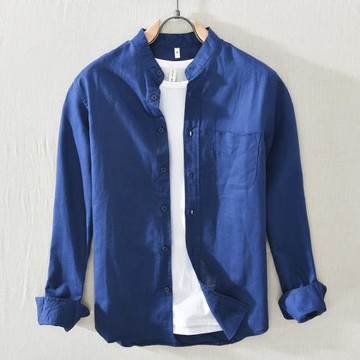 春秋男士長袖亞麻襯衫立領棉麻襯衣日系青年休閑工裝純色寸衫上衣