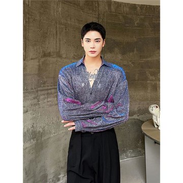 韓國ins亮面網紅寬松V領襯衣男女韓版偏光閃亮流光夜店舞臺裝襯衫
