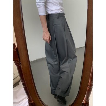 點我下載MION 復活灰色眼淚 韓版設計感休閑褲男寬松直筒闊腿西裝褲褶皺