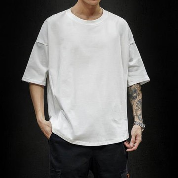 2026年青年潮男純色黑白大碼短袖男圓領休閑夏季落肩寬松半袖T恤