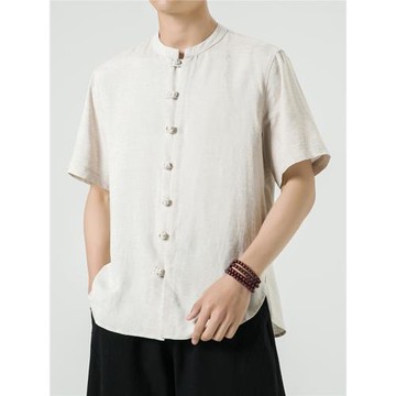 中國風男裝中式盤扣立領襯衫七分袖秋季新款亞麻唐裝寬松復古寸衣