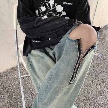 破洞牛仔褲男春秋直筒潮牌高街vibe拉鏈褲子美式復古痞帥休閑長褲