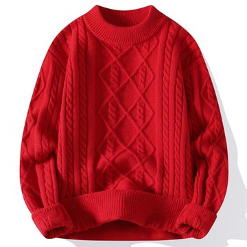 大紅色本命年2025新款秋冬季毛衣男士半高領麻花紋寬松針織衫線衣