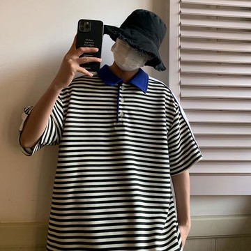 2025夏季青年寬條紋男士t恤polo衫潮牌百搭短袖純棉翻領拼色體恤
