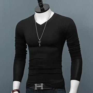 男士V領長袖T恤莫代爾打底衫修身百搭純色秋季上衣韓版體恤秋衣潮