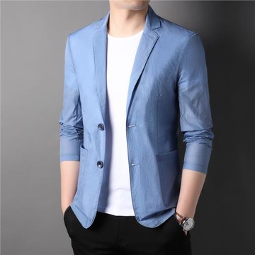 西服男修身休閑長袖青年天藍色西裝薄外套單西時尚帥氣加大碼日常
