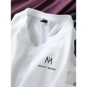 高級感 冰絲無痕V領短袖男t恤絲光棉薄款印花夏天衣服設計感小眾