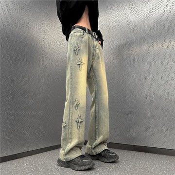 UUCSCC美式潮牌復古拖地直筒牛仔褲vintage壓花工裝闊腿大碼長褲