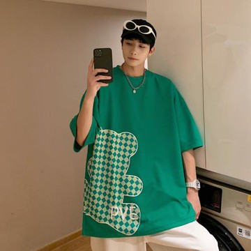 華夫格短袖男夏季寬松小熊t恤ins港風潮流半袖上衣青少年圓領體恤