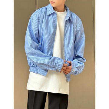 藍色條紋襯衫男長袖高級感外套痞帥外穿情侶寬松春秋夏季美式襯衣