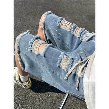 美式復古破洞潑墨牛仔短褲男夏季薄款潮牌外穿五分褲子毛邊乞丐褲