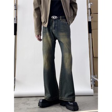 SNEIKLAU 美式復古高街微喇叭褲男黃泥水洗直筒小眾做舊牛仔褲