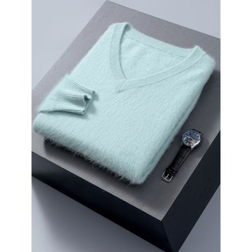 冬季男士貂絨衫休閑加厚套頭貂毛毛衣純色保暖大碼V領打底針織衫