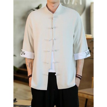 點我下載中國風男裝復古盤扣唐裝外套男寬松夏季中式刺繡仙鶴中袖亞麻襯衫