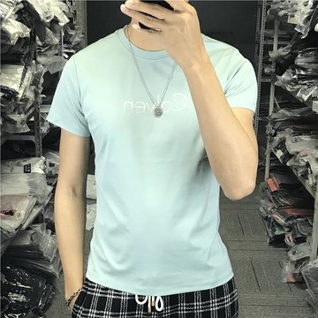 歐美簡約男裝潮牌雙絲光純棉涼感修身簡約百搭字母印花短袖T恤綠