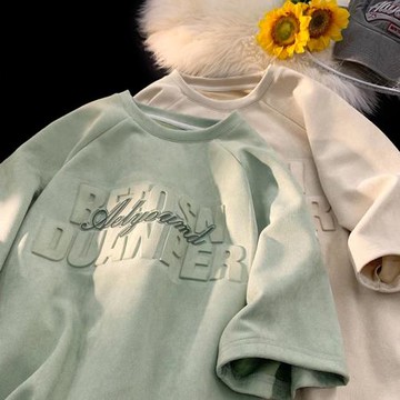 美式復古短袖男夏季重磅t恤鹿皮絨上衣字母印花高級感半截袖體恤