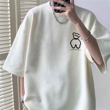 華夫格短袖男夏季重磅小熊t恤ins港風潮流寬松半袖體恤五分袖上衣