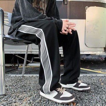 休閑長褲男春秋新款垂感拖地褲側邊條紋寬松運動褲青少年直筒褲潮