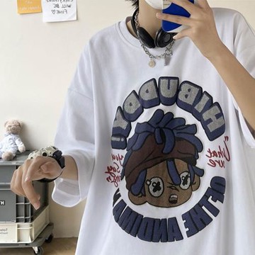 純棉卡通印花短袖t恤男夏季港風寬松休閑五分袖體恤ins潮流上衣服