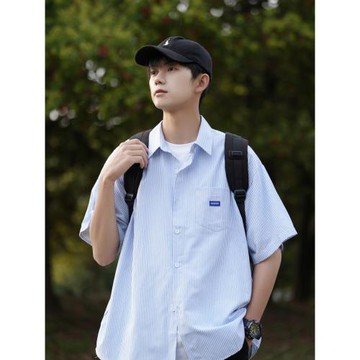 藍色條紋短袖襯衫男夏季薄款潮牌痞帥日系潮流寬松五分袖襯衣外套