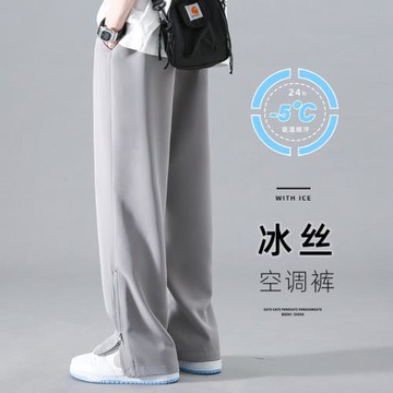 冰絲褲子男夏季垂感闊腿褲拉鏈開叉拖地褲直筒寬松運動褲休閑長褲