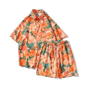 男士印花短袖套裝 短褲寬鬆大尺碼襯衫 沙灘短袖印花襯衫