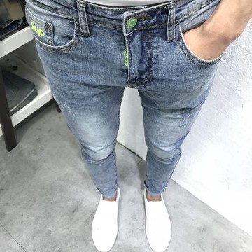 潮男春夏新韓版修身貓須淺藍小腳牛仔褲青年社會小伙網紅快手chic