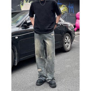 日春多元化 牛仔褲男款2023復古做舊水洗寬松直筒垂感ins闊腿長褲