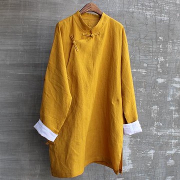 中國風亞麻立領大襟斜襟中長外套上衣唐裝大碼寬松禪修茶道復古