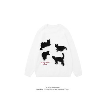 WHXS美式復古兔子剪影水貂毛圓領毛衣男秋季寬松情侶裝百搭針織衫